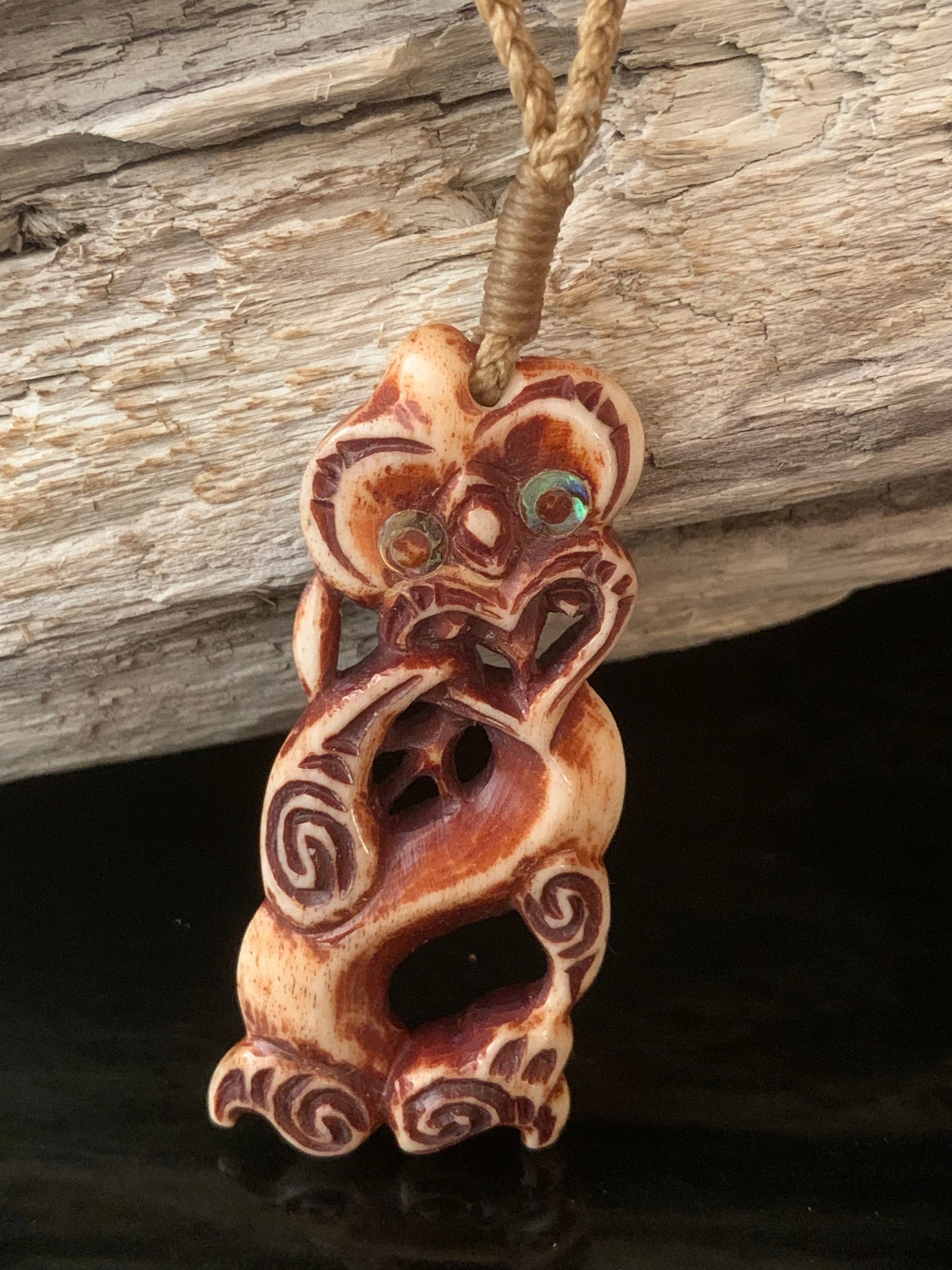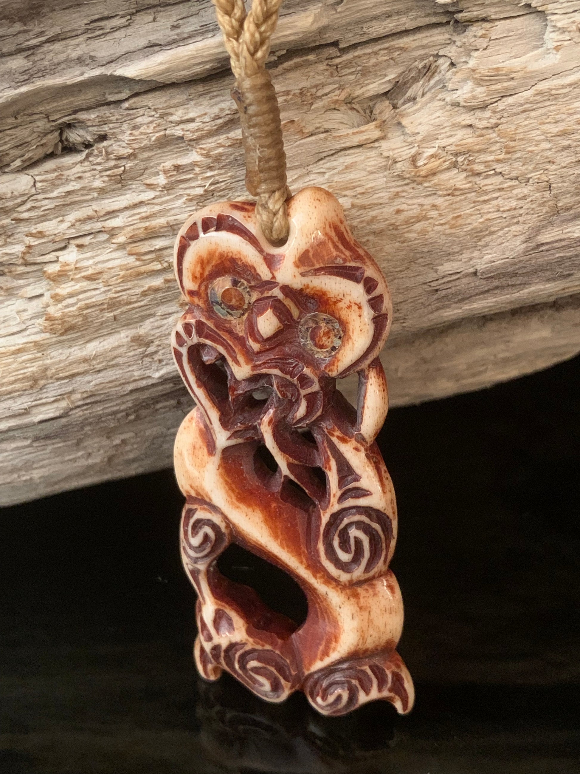 Hand dyed beef bone hei tiki pendant by Alex Sands