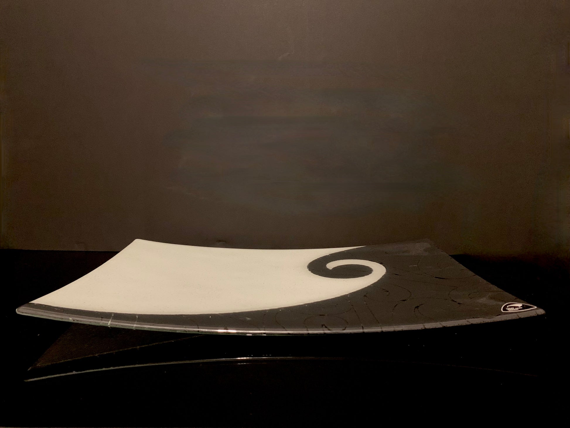 Fused Glass Platter by Maori Boy - Koru Furl Design (white and graphite) 40 x 27cm