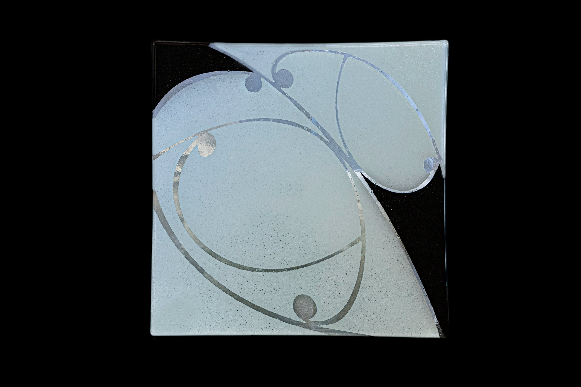 The technique of 'fusing and slumping' sandwiches a design of "onglaze powder" between two pieces of clear glass, which is then fused together at high temperature. The transparency of the top layer lends the design depth and enhances the vibrancy of each colour. Low fire “glaze” is traditionally used by ceramists as a ‘second’ firing over underglaze on fired pots. Low fire glaze will fire into glass using a very careful firing process aided by a 'proprietary formular' of frits and additives to promote compatibility, stability of the fusing process, and to enhance the vibrancy of the colours. The glaze is used ‘dry’ and not in a liquid form.