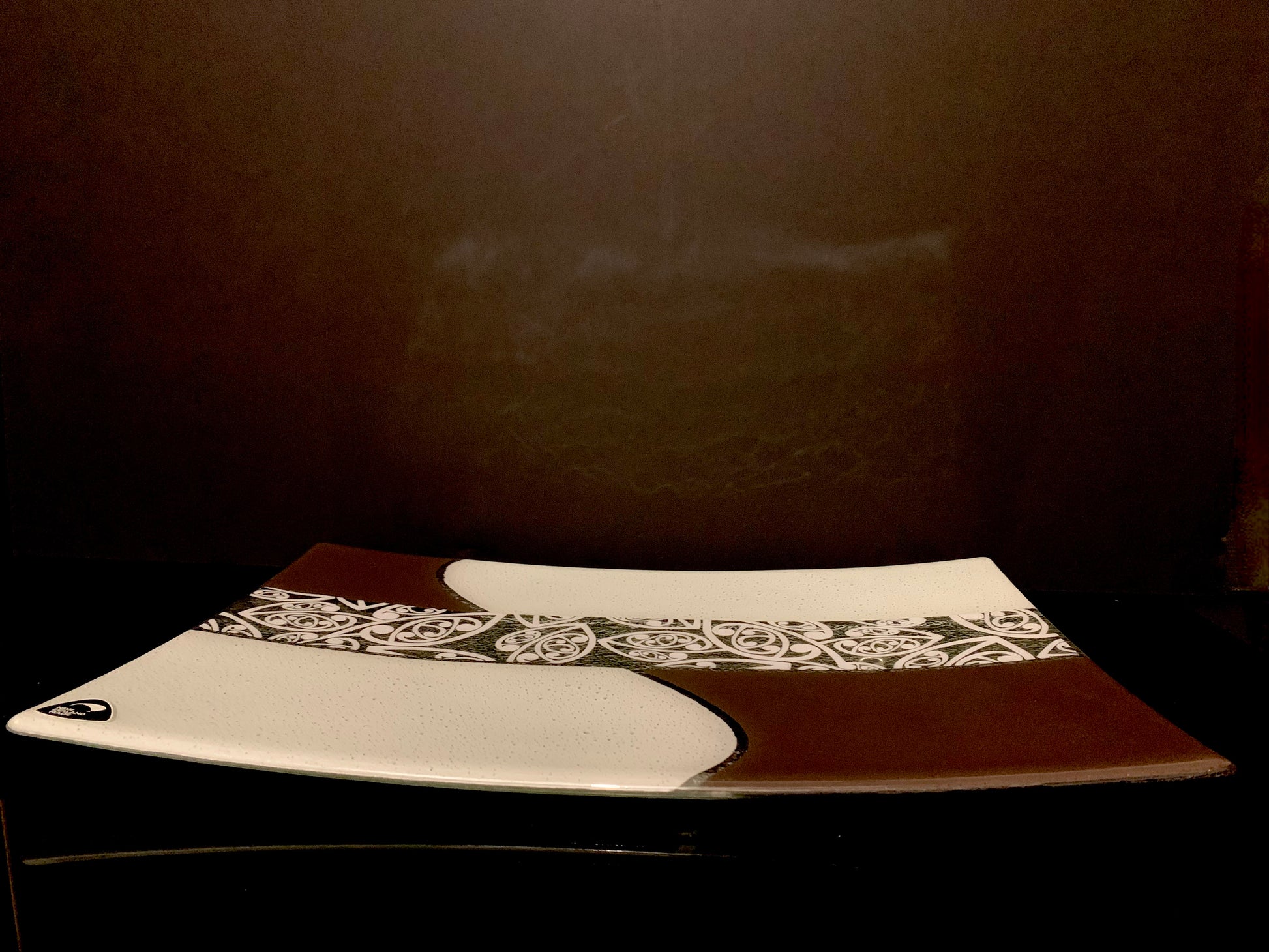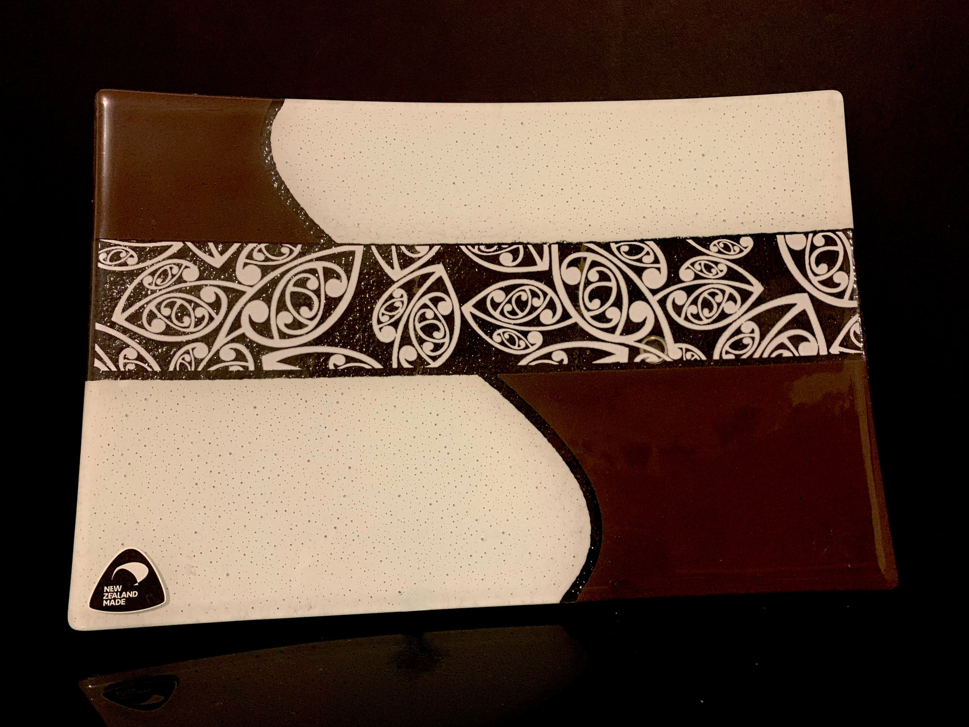 Fused Glass Platter by Maori Boy - Kowhaiwhai Design (Brown and White) 30cm x 20cm