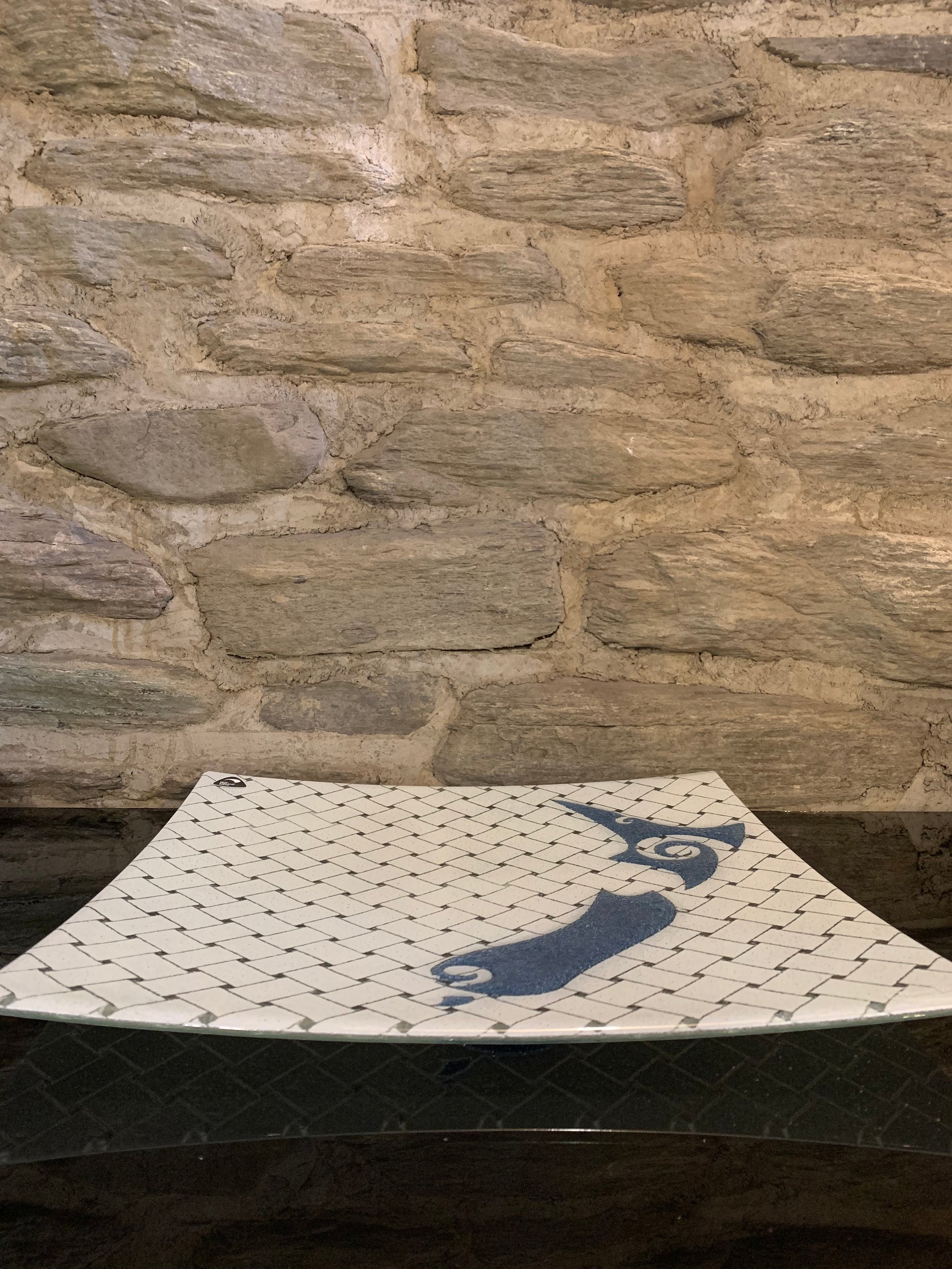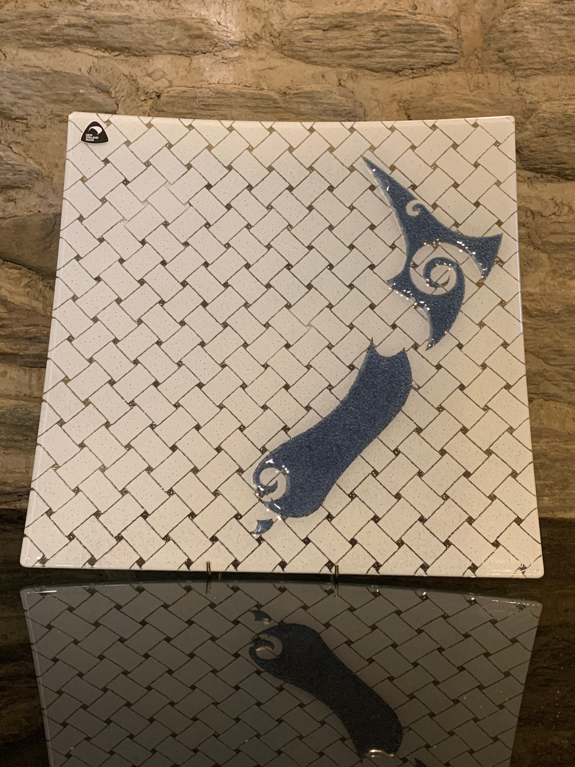 Fused Glass Platter by Maori Boy - Aotearoa Kete Design (White and Blue) 40cm